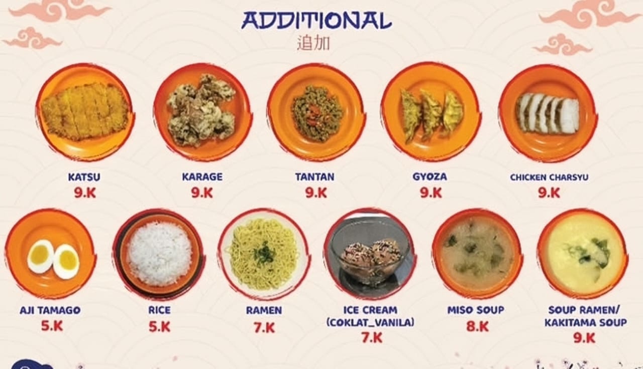 Additional adalah pilihan lauk atau tambahan seperti Katsu, Karage, Tantan, Gyoza, Chicken Charsyu, Aji Tamago, Rice, Ramen (mi), Miso Soup, dan Soup Ramen, yang berfungsi melengkapi atau menambah porsi pada hidangan utama sesuai selera pelanggan.